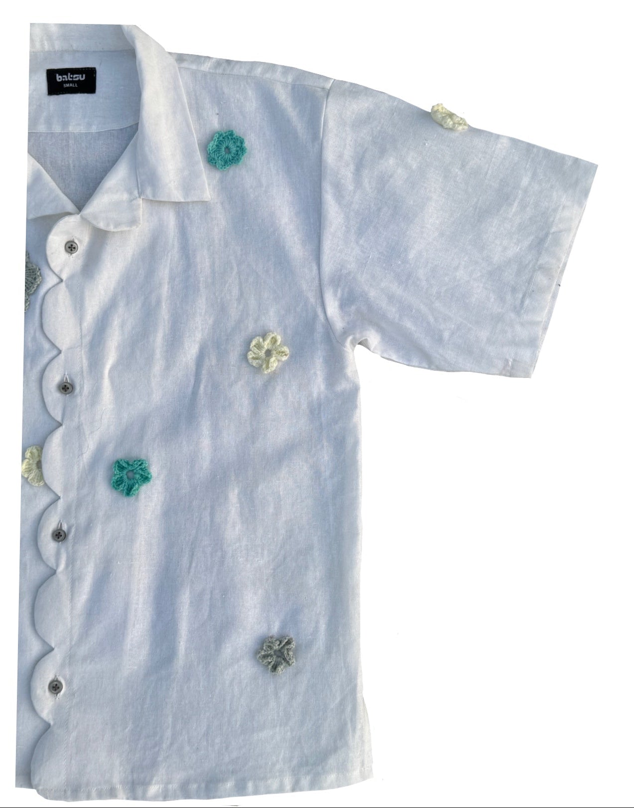 This is a white, short-sleeved button-up shirt with a relaxed fit and a classic camp collar. The fabric appears to be lightweight, possibly linen or cotton, making it breathable and ideal for warm weather. The standout feature is the scattered, hand-stitched crochet floral appliqués in soft pastel shades of blue, green, and cream, adding a charming, artisanal touch. The buttons have a decorative metallic design, enhancing the shirt’s vintage-inspired aesthetic.