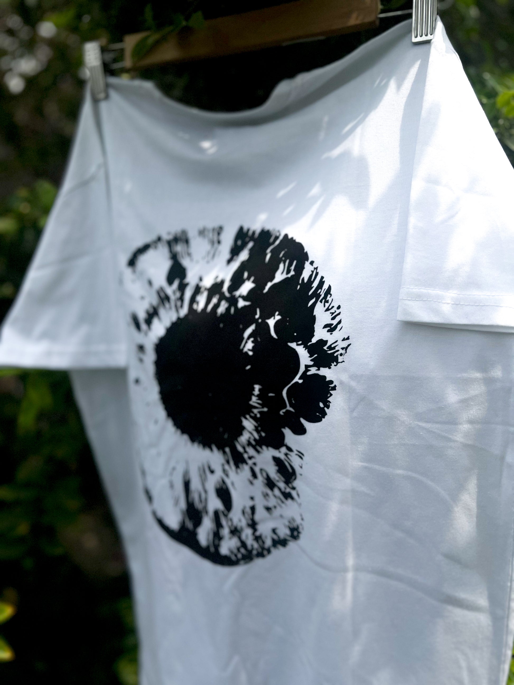 Graphic: Inspiration taken from human iris part of an eye, screen print in single colour in the back. In the front name is written on the left side of the shirt.