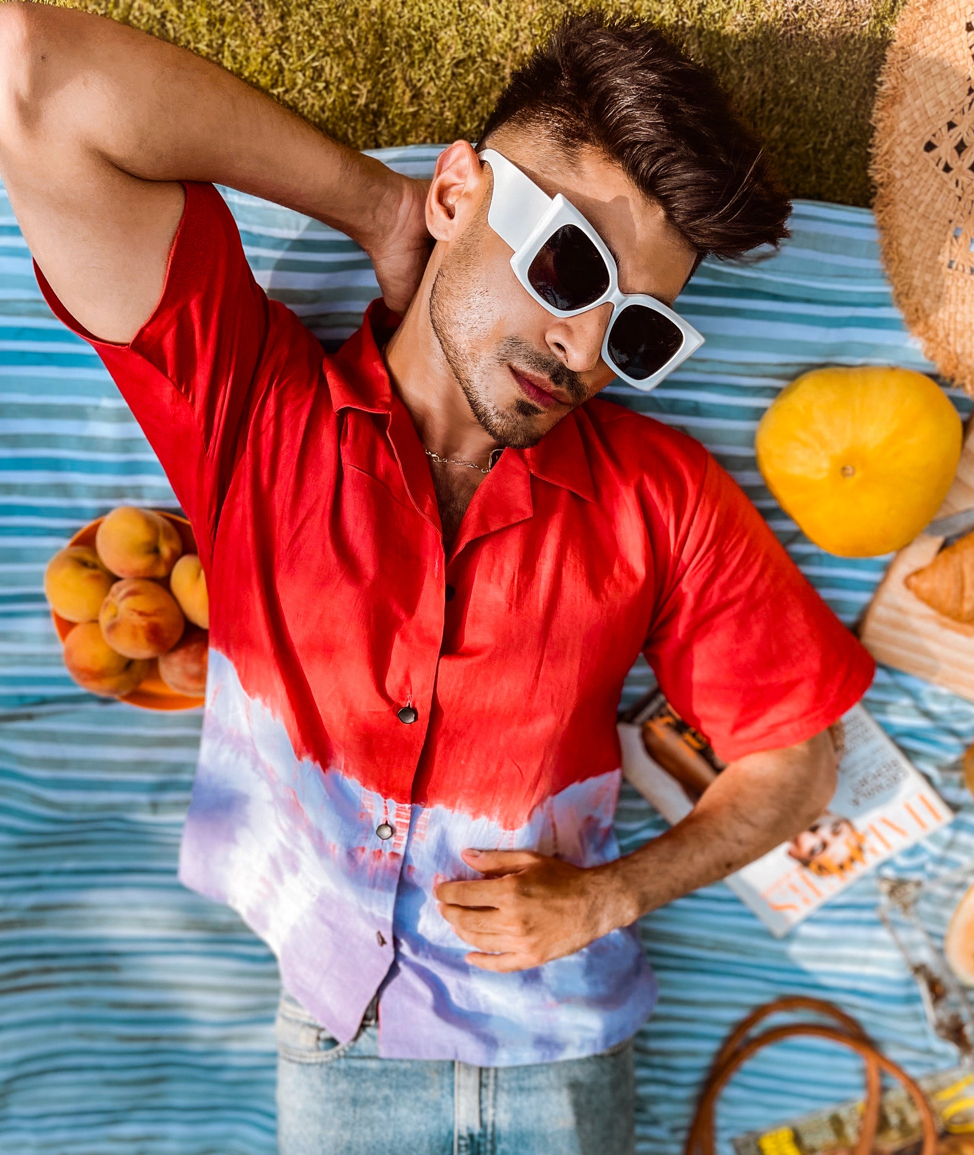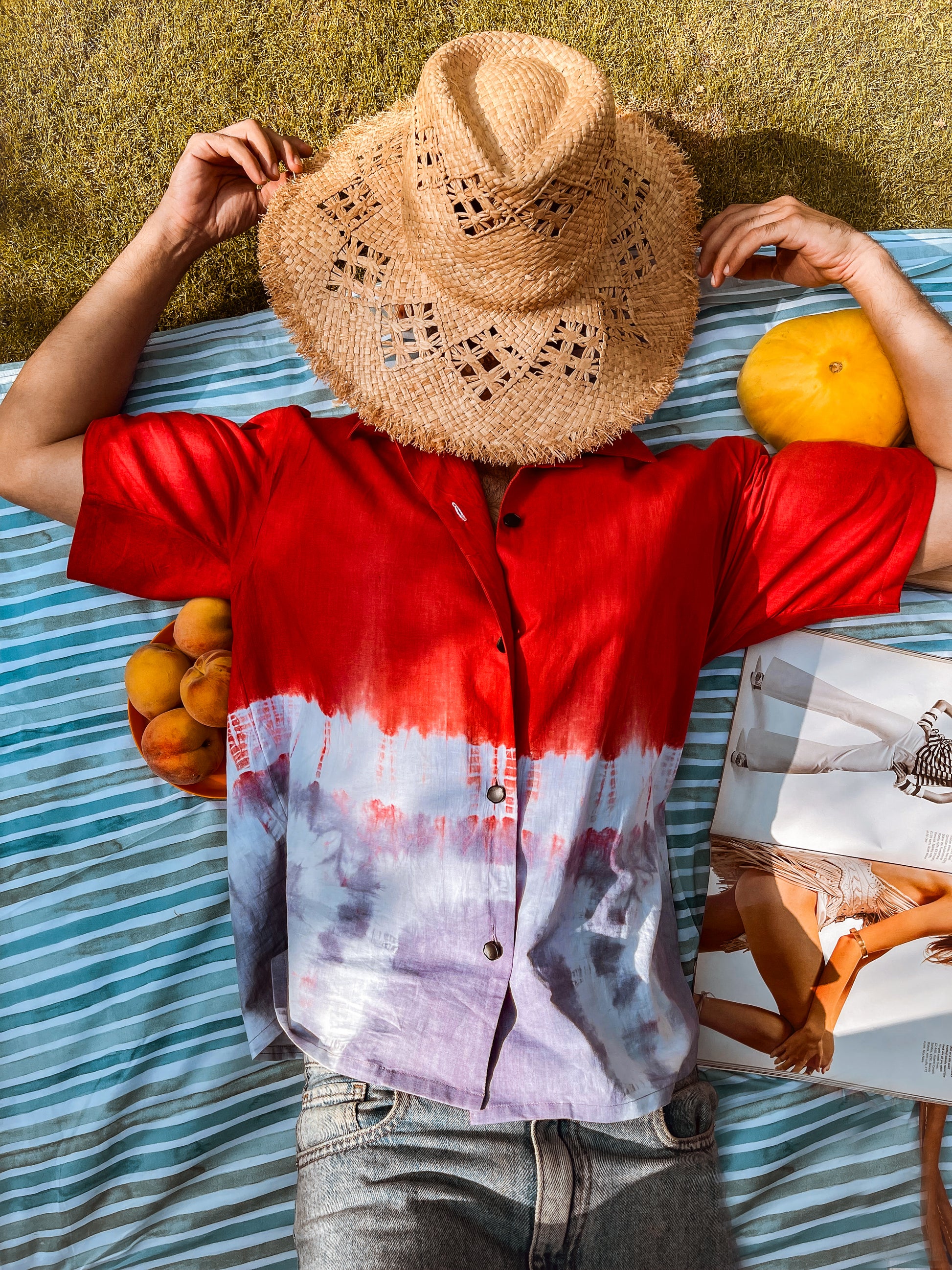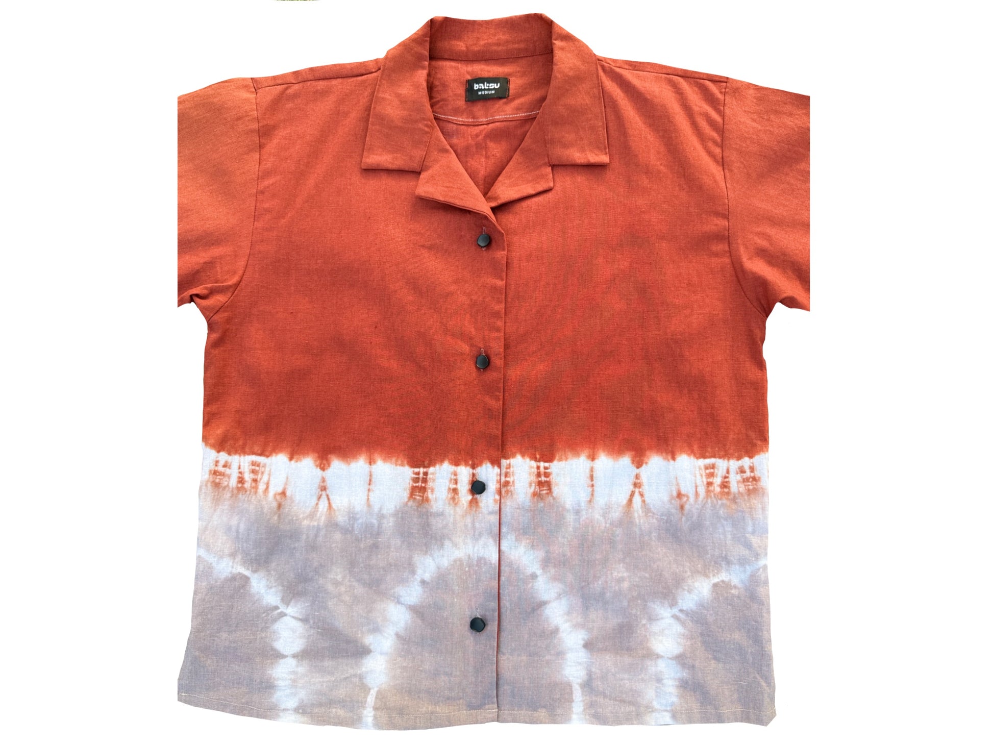 This is a short-sleeved button-up shirt with a bold, earthy aesthetic. The upper half is a warm, rusty terracotta shade, while the lower half features a white tie-dye effect, creating a striking contrast. The relaxed fit and camp collar add to its casual yet stylish appeal, making it perfect for a laid-back yet confident look. The fabric appears lightweight, making it ideal for warm weather.