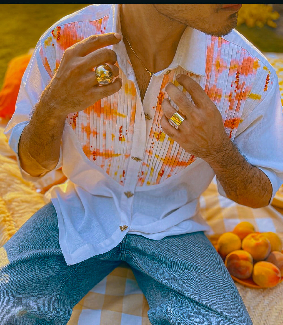 The shirt is a white, short-sleeved button-up with a classic pointed collar. It features a pleated design on the upper chest area, accentuated by a vibrant, abstract pattern in warm tones of orange, yellow, and red. The fabric appears lightweight, making it suitable for warm weather. The buttons are small and delicate, blending subtly into the design.